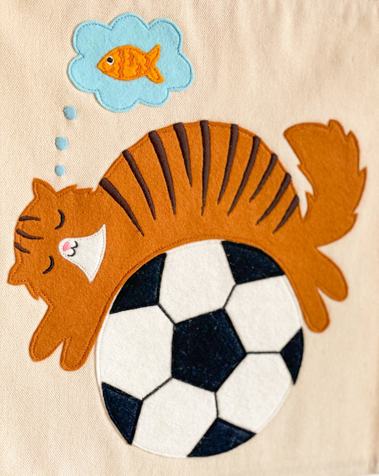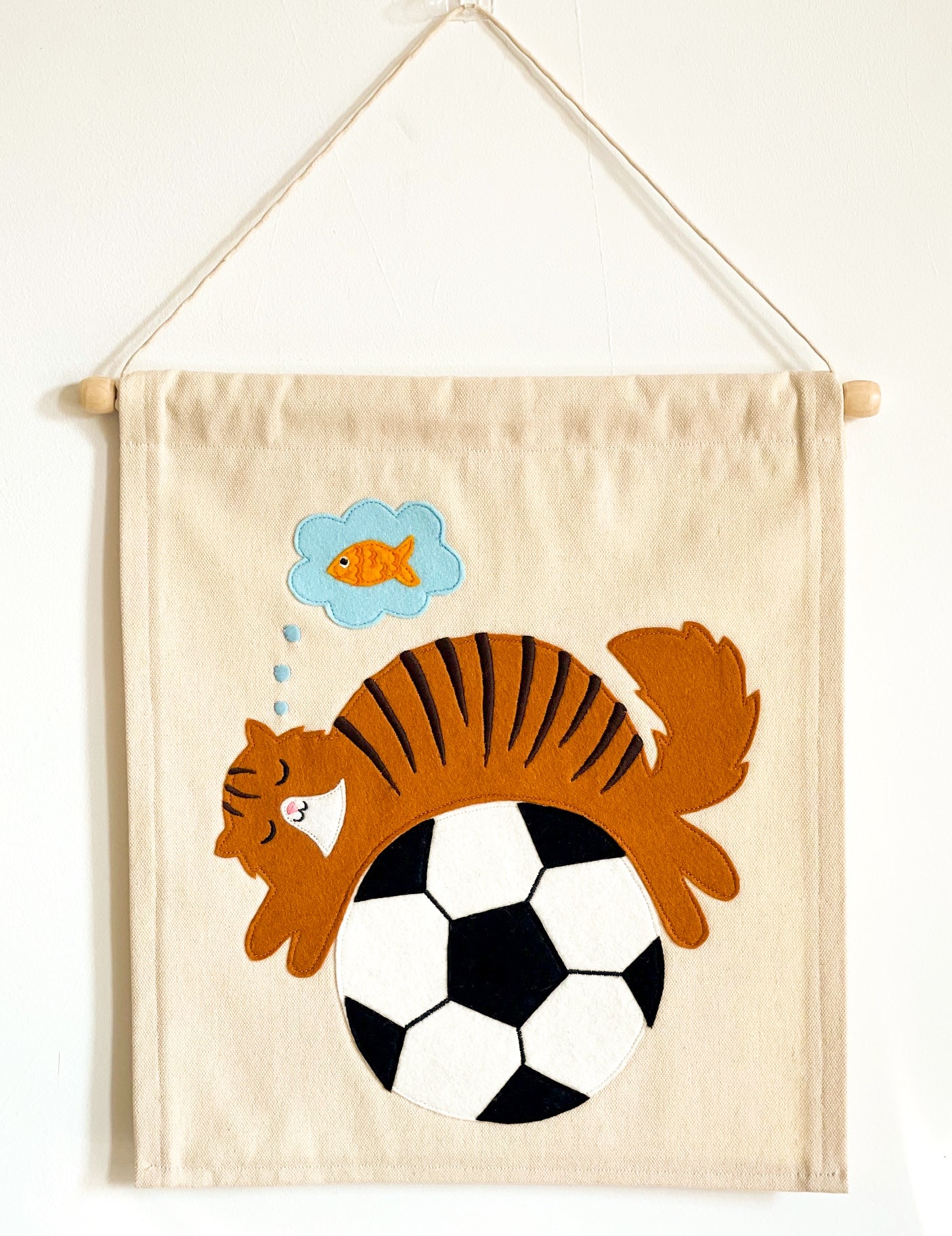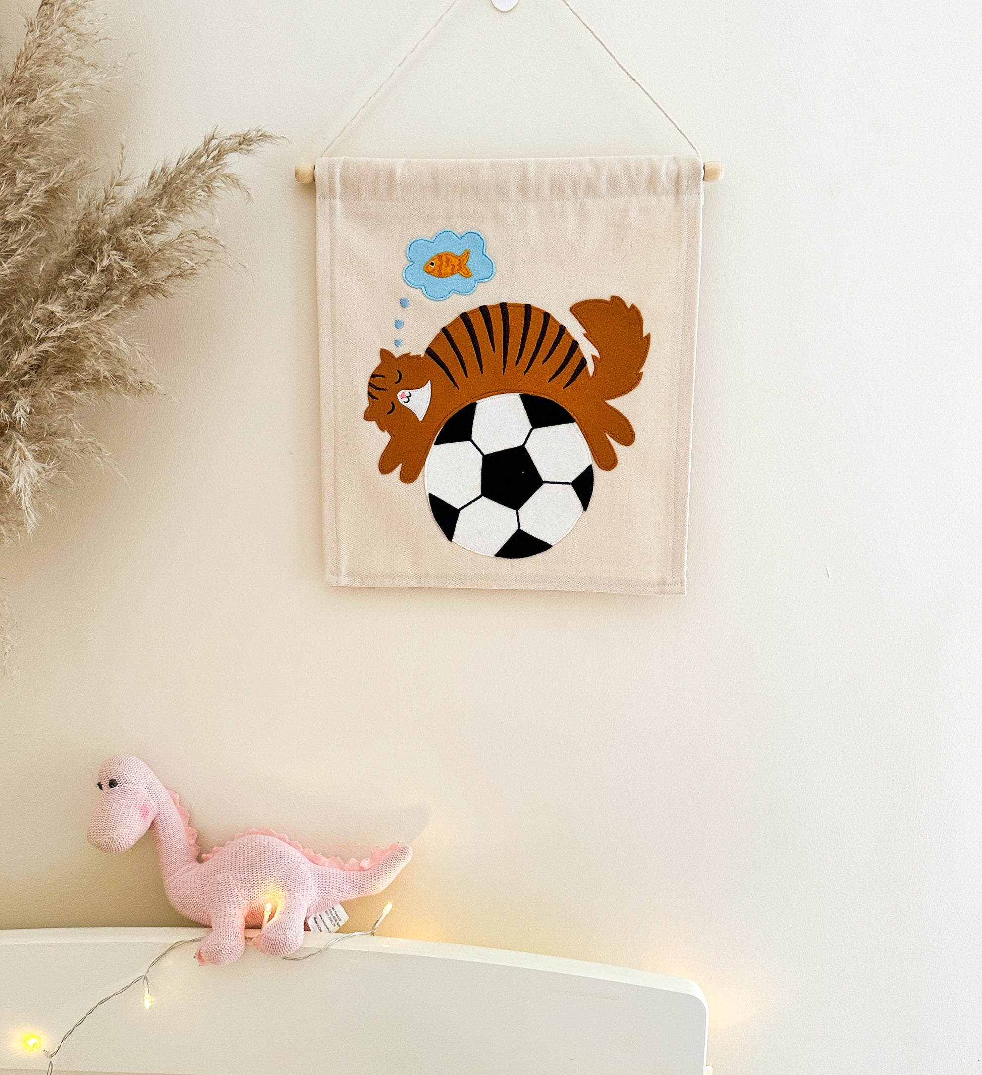 Transform your child's bedroom into a magical wonderland with our handmade Dreamer cat wallhanging. Featuring a napping cat on a football, dreaming of fish, this decor is made with premium wool and organic washed canvas for a soft and tactile feel. Ethically crafted and thoughtfully designed, add a unique touch to your child's space. Perfect for bedroom walls or doors, with personalisation options too, Dreamer makes the perfect gift.
