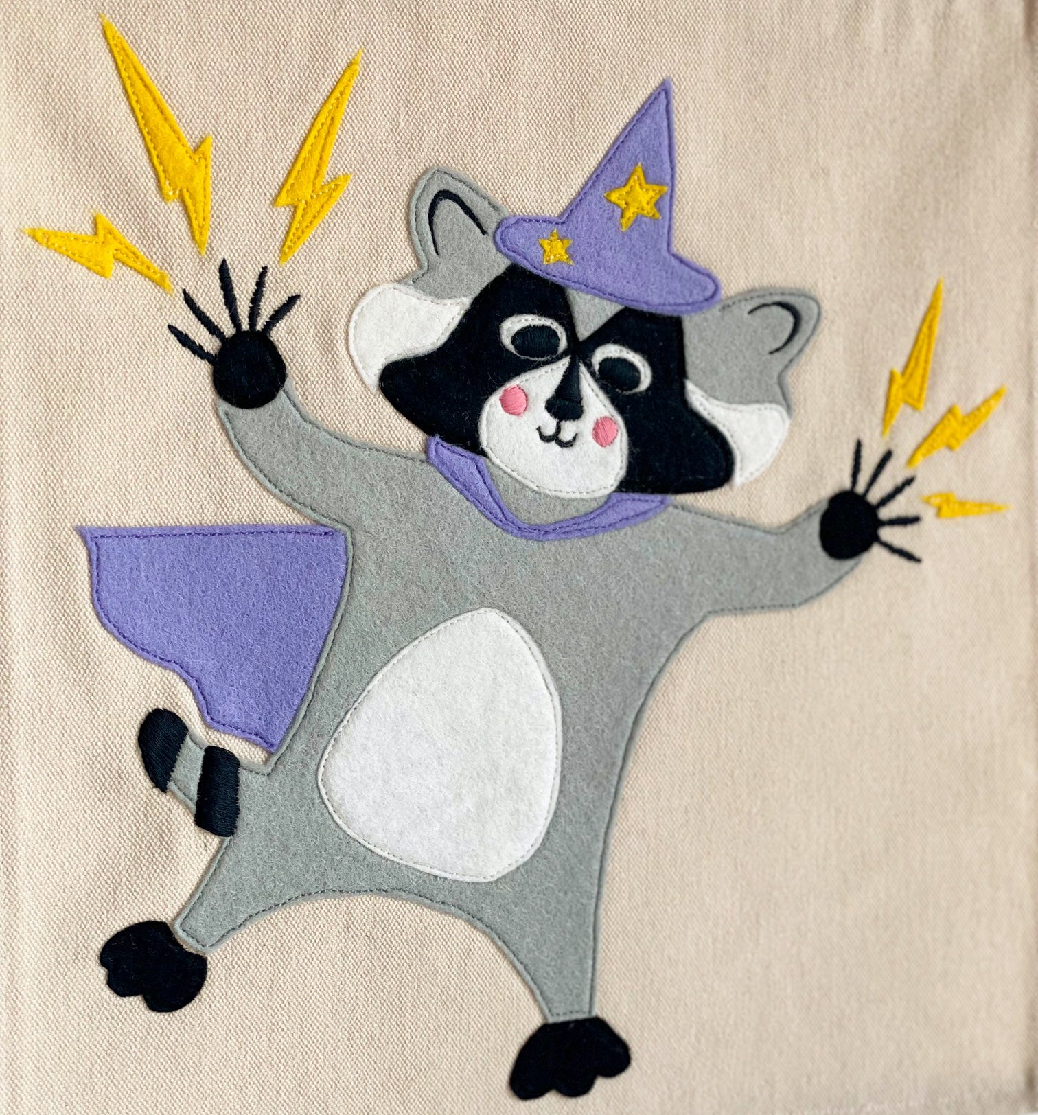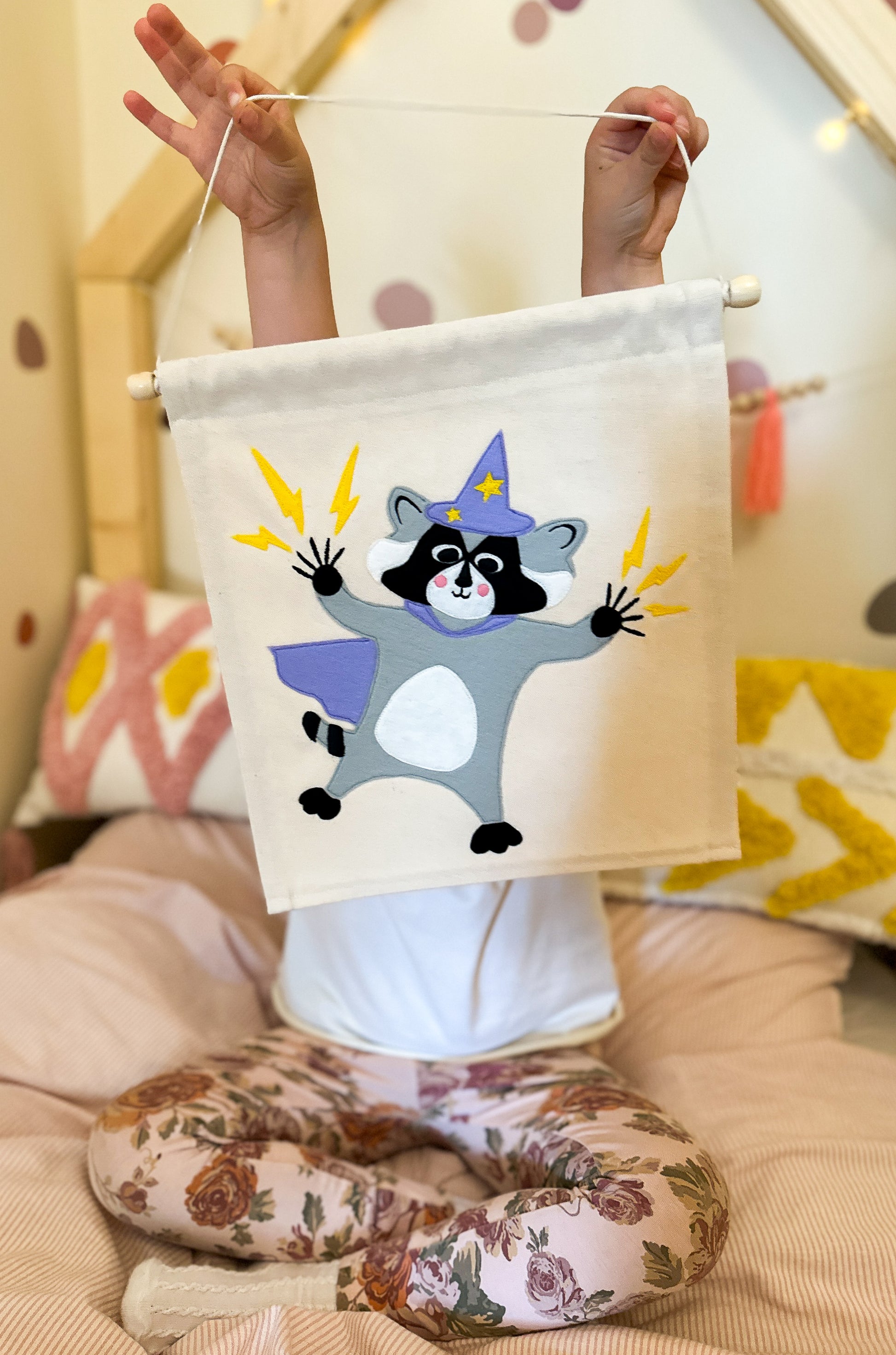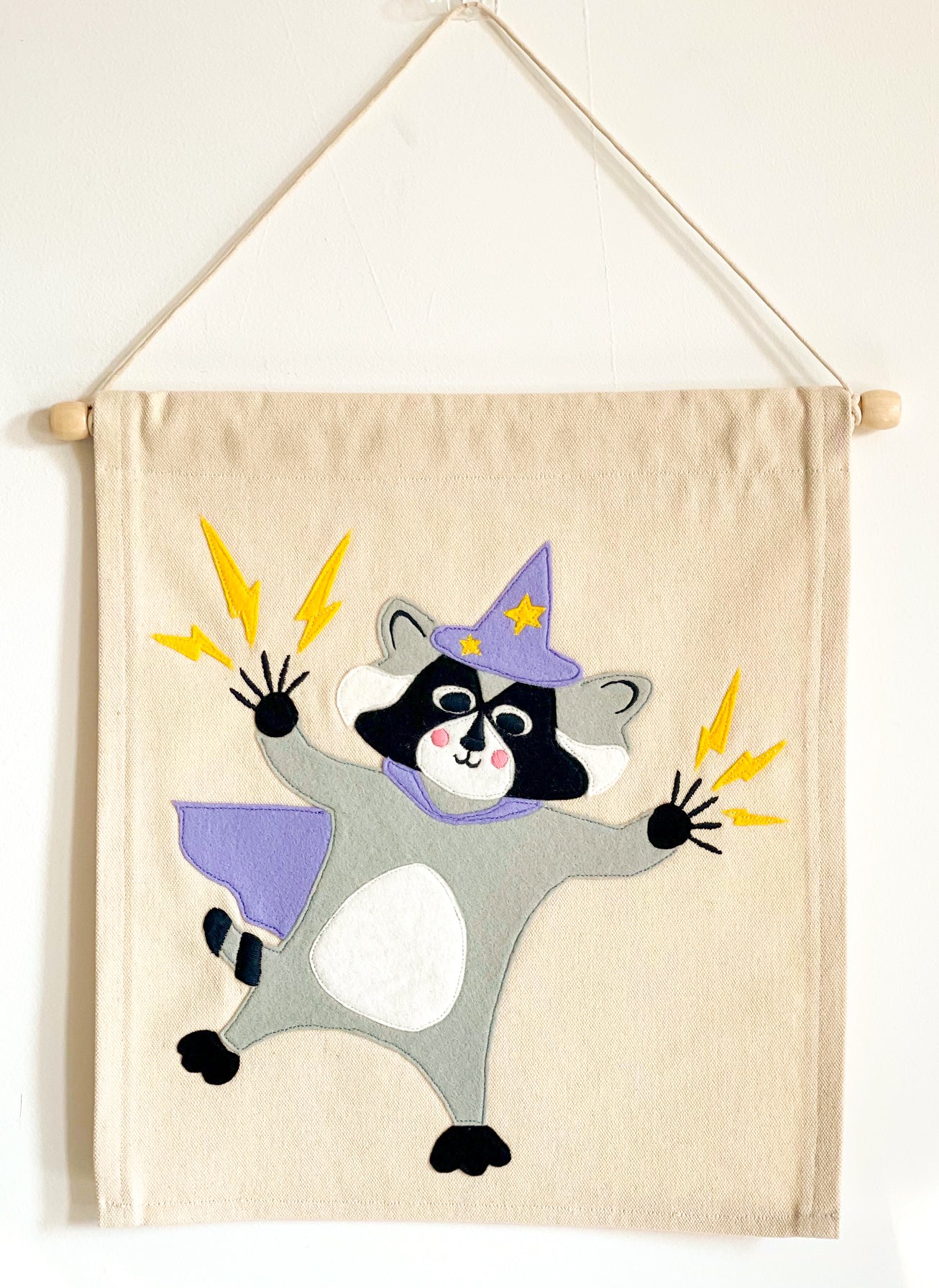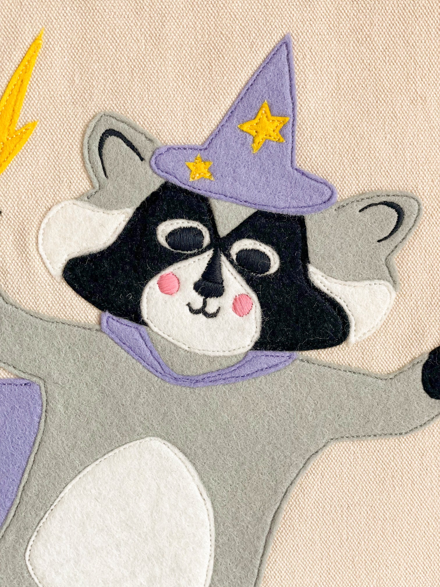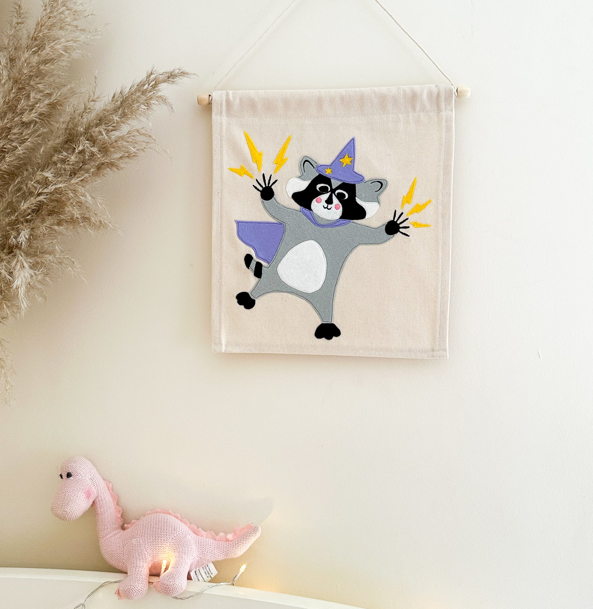 Transform your child's bedroom into a magical wonderland with our handmade Charmer racoon wallhanging. Featuring a wonderful wizard get up, this decor is made with premium wool and organic washed canvas for a soft and tactile feel. Ethically crafted and thoughtfully designed, add a unique touch to your child's space. Perfect for bedroom walls or doors, with personalisation options too, Charmer makes the perfect gift.