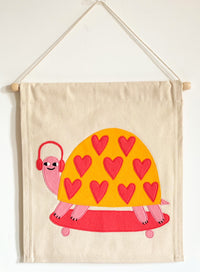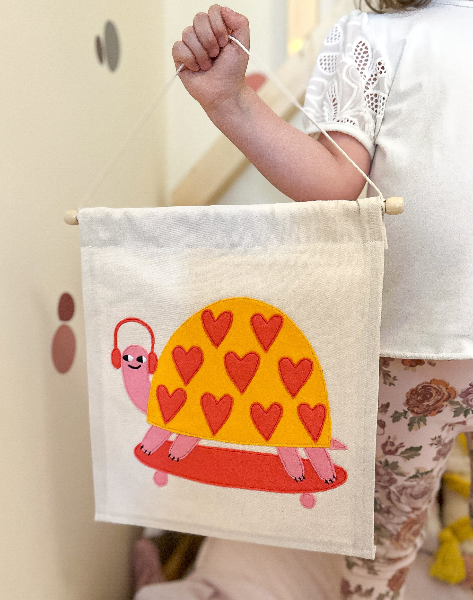 Transform your child's bedroom into a magical wonderland with our handmade Shelly tortoise wallhanging. Featuring a skateboard, pink headphones and so much love, this decor is made with premium wool and organic washed canvas for a soft and tactile feel. Ethically crafted and thoughtfully designed, add a unique touch to your child's space. Perfect for bedroom walls or doors, with personalisation options too, Shelly makes the perfect gift.